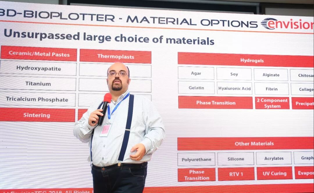 同时,Dr. Carlos Carvalho代表德国EnvisionTEC正式发布了全新的打印头,包含超高温打印头、双组份打印头,同时升级了紫外固化头和高温打印料筒。另外,全新的硬件可支持客户在PEEK打印、血管打印、生物弹性体打印等方面的应用,会议现场同步发布了新的打印材料和打印软件。
